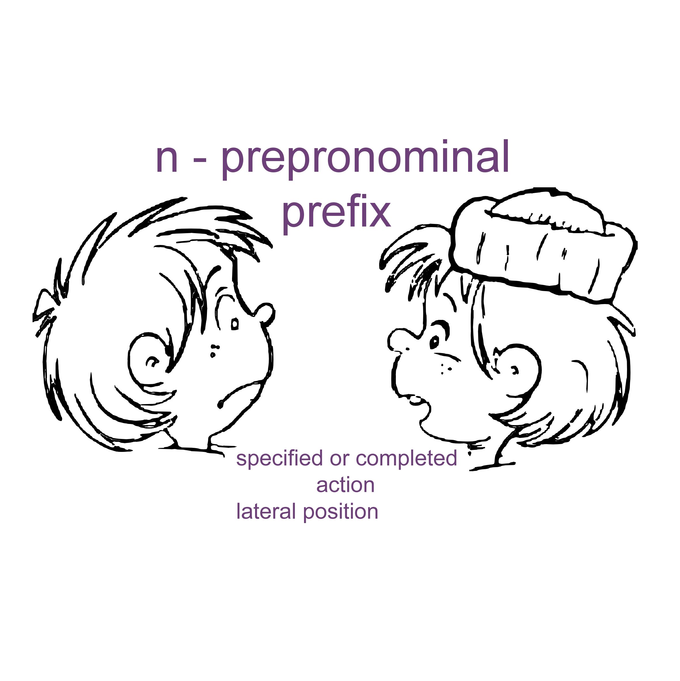 n – prepronominal prefix usually occurs with ‘to do’ (advneha) verbs when referring to a past event. The activity is either specified or completed. Another words, it is understood that someone or something is doing something, but the exact nature may not be known.