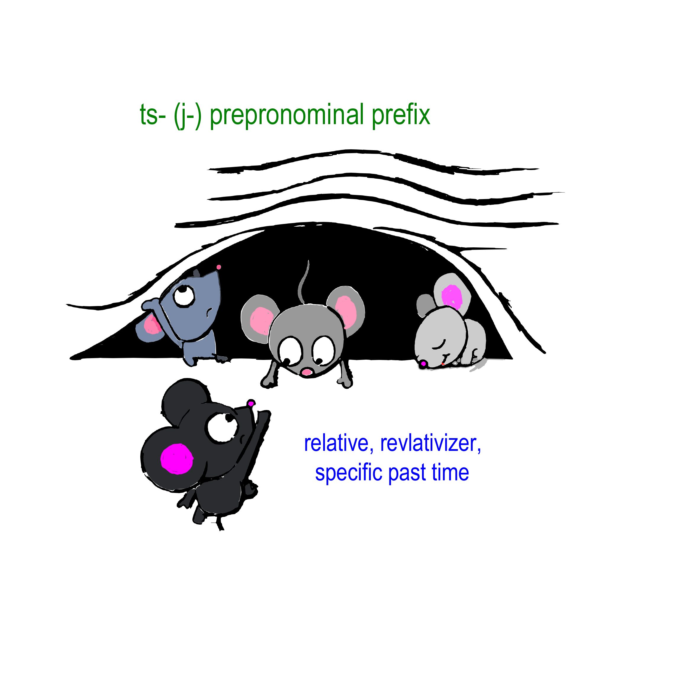 *As noted in the sentence above, ts- is required in sentences which reference to a specific past time is understood provided the past tense suffix (-vʔi) is used. This suffix indicates the speaker witnessed the action or state indicated by the verb form. It is also used with the reportative past tense suffix (-eʔi).