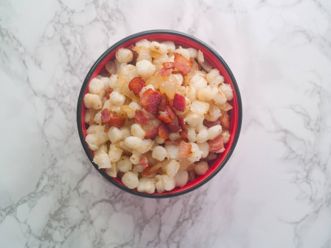 Crumble or cut bacon and return to pan; add the drained hominy. Salt if needed; add black pepper if you like. Fry until hot.