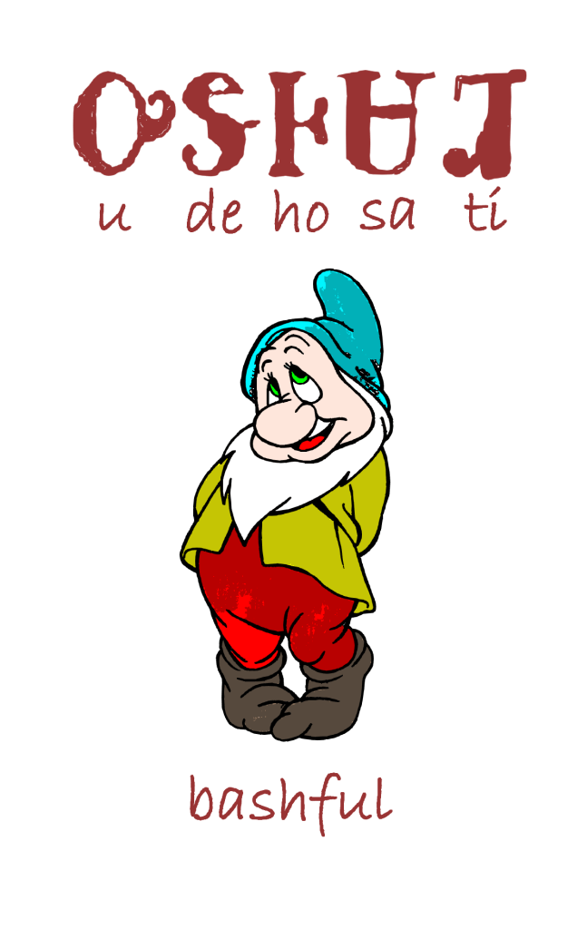 udehosati is bashful in Tsalagi. u is the English oo sound. de is the English d and long a sound in day. ho is the English h and long o sound in ho. sa is the English s and short a sound in sad. ti is the English t and long e sound in tee. udehosati is pronounced oo – d – long a – h – long o – s – short a – t – long e.