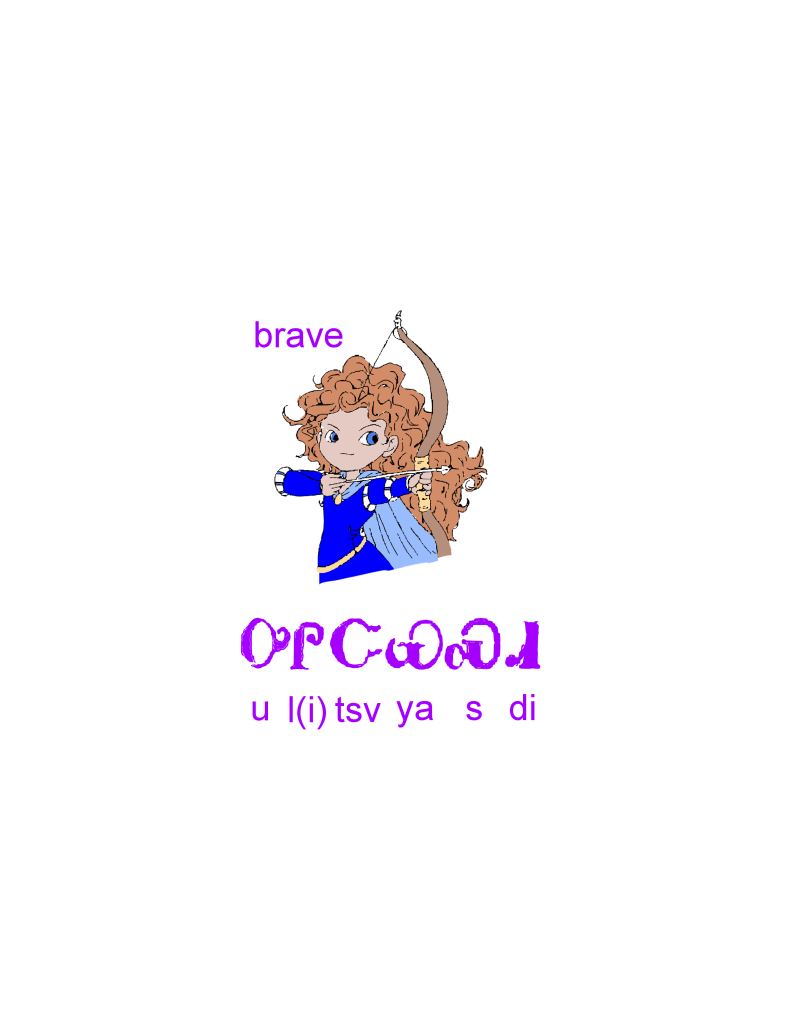 ul(i)tsvyasdi is brave in Cherokee. u is the English oo sounds in ooh. l makes the same English l sound. The i in li is silent. tsv is the English j and nasalized short u sounds in jug. ya is the English y and short a sounds in yap. s makes the same sound in English. di is the English d and long e sounds in Dee. ul(i)tsvyasdi is pronounced oo – l – j – nasalized short u – y – short a – s – d – long e.