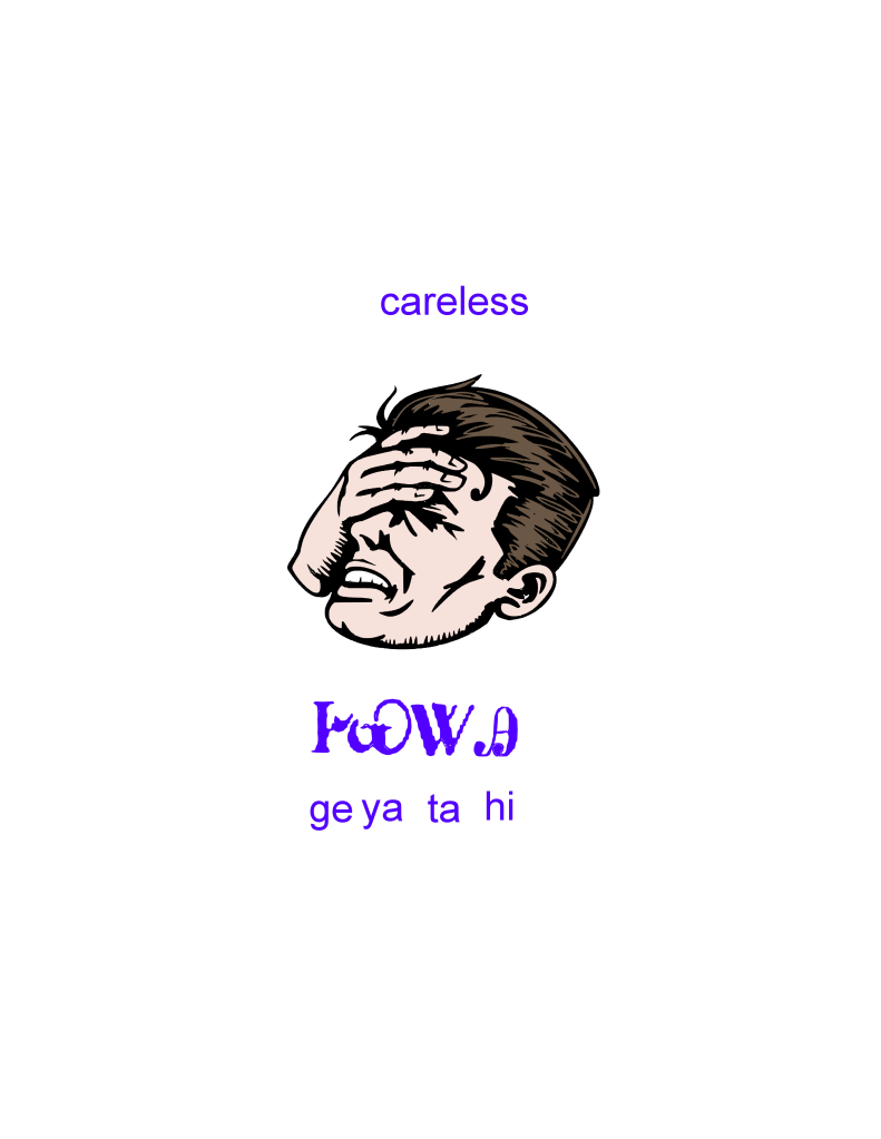 geyatahi is careless in Tsalagi. ge is the English g and long a sounds in gay. ya is the English y and short a sounds in yap. ta is the English t and short a sounds in tar. hi is the English h and long e sounds in he. geyatahi is pronounced g – long a – y – short a – t – short a – h – long e.