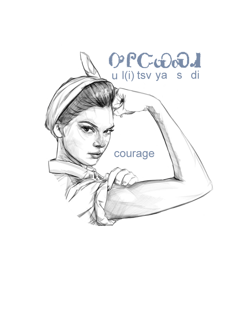 ul(i)tsvyasdi is courage in Tsalagi. u is the English double oo sound in ooh. l is the same l sound in English. The i in li is silent. tsv is the English j and nasalized uh sound in junk. ya and s is the English y, short a, and s sounds in yas. di is the English d and long e sound in Dee. ultsvyasdi is pronounced oo – l – j – nasalized uh – y – short a – s – d – long e.