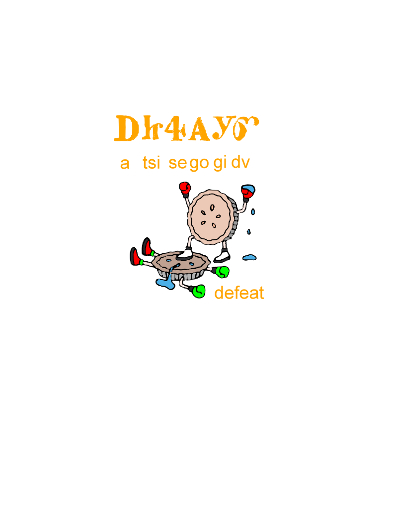 atsisegogidv is defeat in Cherokee. a is the English short a sound in at. tsi is the English j and short i sounds in Jim. se is the English s and long a sounds in say. go is the English g and long o sounds in go. gi is the English g and short i sounds in gift. dv is the English d and nasalized uh sounds in duh. atsisegogoidv is pronounced short a – j – short i – s – long a – g – long o – g – short i – d – nasalized uh.