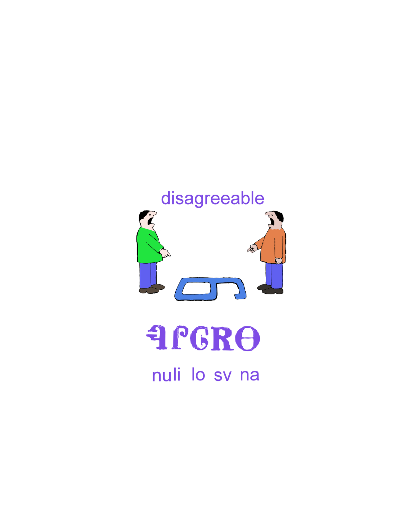 nulilosvna is disagreeable in Tsalagi. nu is the English n and oo sounds in new. li is the English l and short i sounds in lip. lo is the English l and long o sounds in low. sv is the English s and nasalized short u sounds in sung. na is the English n and short a sounds in nap. nulilosvna is pronounced n – oo – l – short i – l – long o – s – nasalized uh – n – short a.