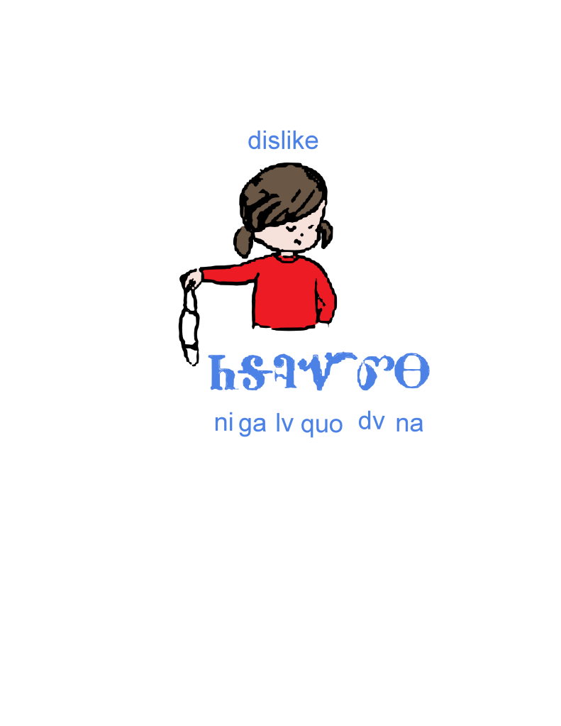 nigalvquodvna is dislike in Tsalagi. ni is the English n and short i sounds in nit. ga is the English g and short a sounds in gap. lv is the English l and nasalized short u in lung. quo is the English gw and long o sounds in quote. dv is the English d and nasalized short u sounds in duh. na is the English n and short a sounds in nap. nigalvquodvna is pronounced n – short i – g – short a – l – nasalized uh – gw – long o – d – nasalized short uh – n – short a.