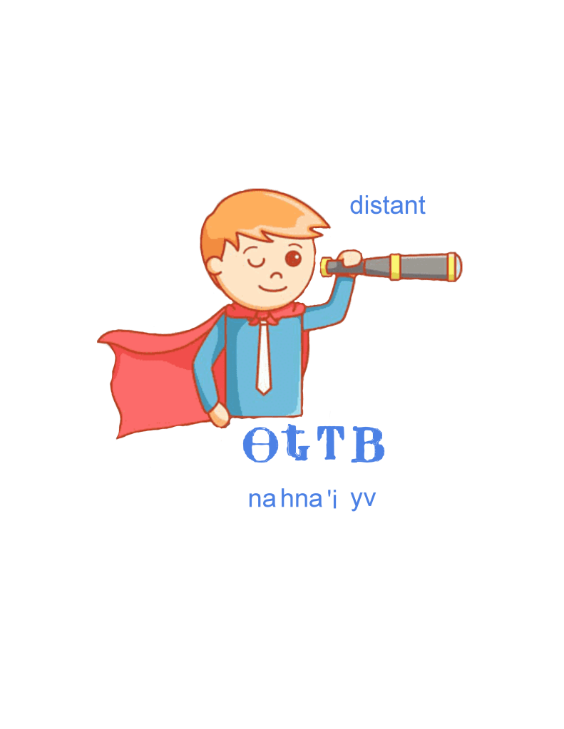 nahna’iyv is distant in Tsalagi. na is the English n and short a sounds in nap. hna is a breathy English n and short a sounds that is harder to translate in English, but essentially a h, n and short a sounds. There is a glottal stop between two vowels, a short brief pause. i is the English long e sound in e. yv is the English y and nasalized short u sound in yuck. nahna’iyv is pronounced n – short a – h – n – short a – glottal stop – e – y – nasalized uh.