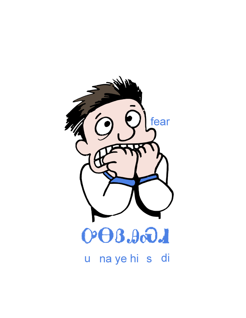 unayehisdi is fear in Tsalagi. u is the English oo sound in ooh. na is the English n and short a sounds in nap. ye is the English y and long a sounds in yay. hi and s is the English h, short i, and s sounds in his. di is the English d and long e sounds in dee. unayehisdi is pronounced oo – n – short a – y – long a – h – short i – s – d – long e.