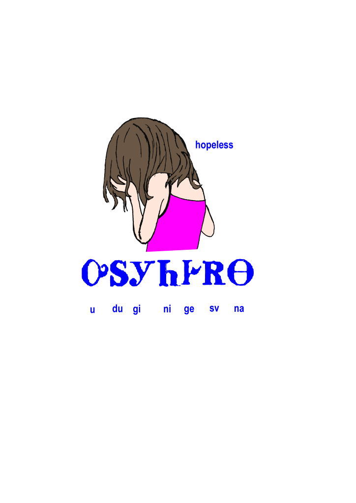 owelihisdisga is anxiety in Tsalagi. o is the English oo sound in ooh. we is the English w and long a sounds in way. li is the English l and short i sounds in lip. hi and s make the English h, short i, and s sounds in his. di and s make the English d, short i, and s sounds in district. ga is the English g and short a sounds in gap. owelihisdisga is pronounced oo – w – long a – l – short i – h – short i – s – d – short i – s – g – short a.