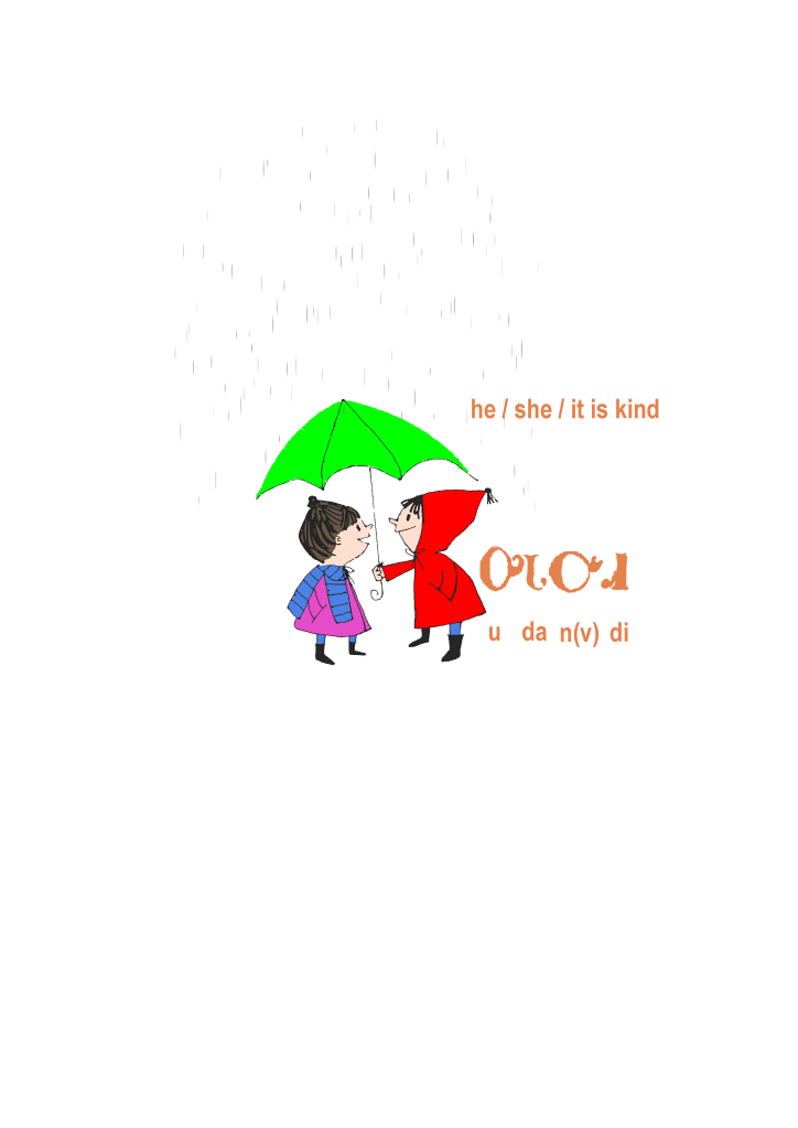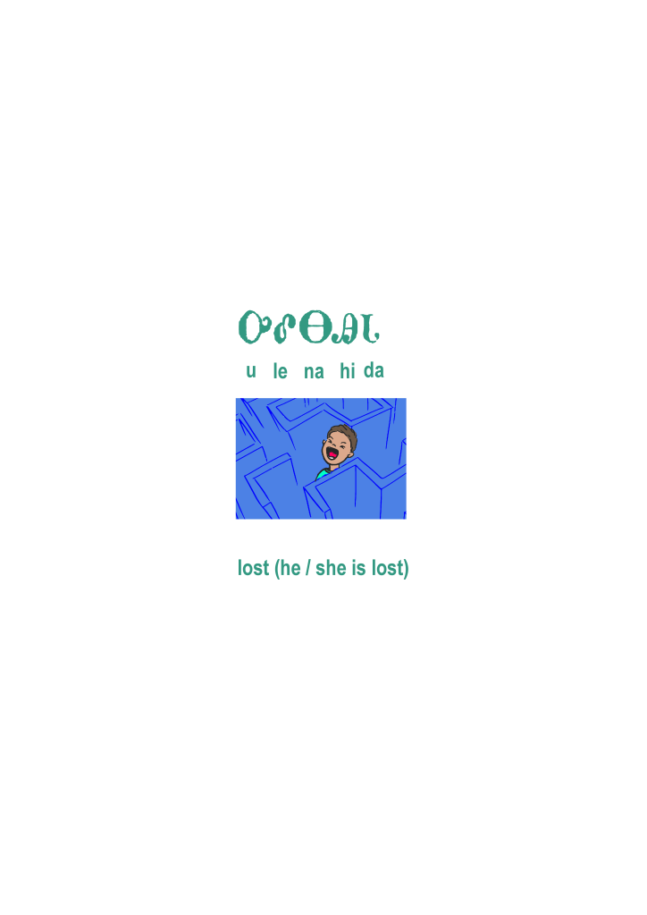 yeli’iyadvnehi is competent in Tsalagi. ye is the English y and long a sounds in yay. li is the English l and short i sounds in lip. The is a glottal stop, a small breath. i is the English long e. ya is the English y and short a sounds in yam. dv is the English d and nasalized uh in duh. ne is the English n and long e sounds in nay. hi is the English h and long e in he.