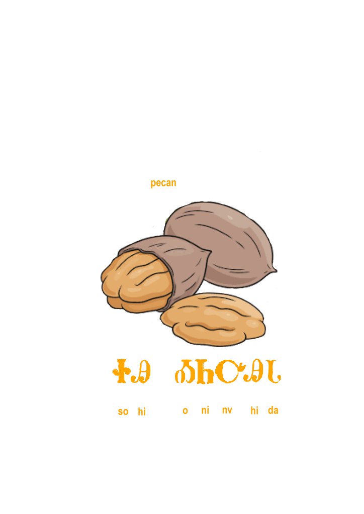 sohi oninvhida is pecan in Tsalagi. so is the English s and long o sounds in so. hi is the English h and long e sounds in he. o is the English long o sound in oh. ni is the English n and short i sounds in nix. nv is the English n and nasalized short u sounds in numb. hi is the English h and long e sounds in he. da is the English d and short a sounds in da. so hi is pronounced s – long o – h – long e. oninvhida is pronounced long o – n – short i – n – nasalized short u – h – long e – d – short a.